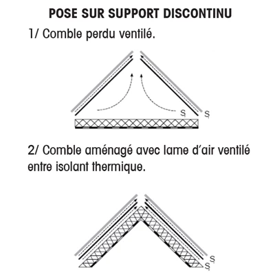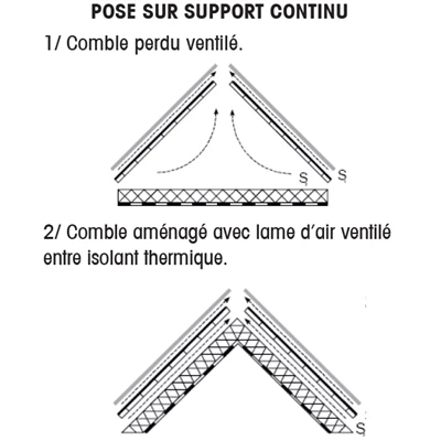 - Pose tendue sur chevrons ou fermettes d’entraxe maximal de 90 cm, ou pose ventilĂ©e en sous-face sur support continu.