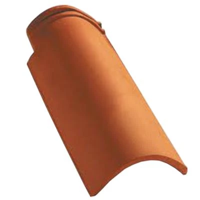 Demi-tuile à emboîtement grand moule faiblement galbée à relief en terre cuite.