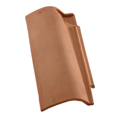 Tuile de rive ronde gauche, gamme Canal S, en terre cuite, permettant une finition parfaite de la couverture au niveau des rampants de pignon.