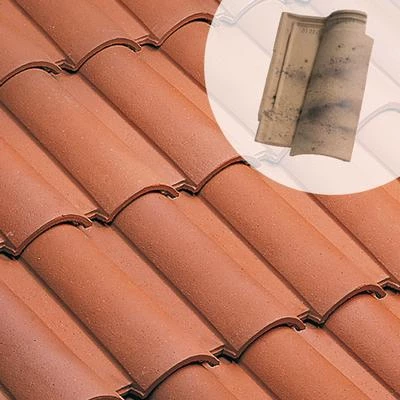 Tuile en terre cuite à emboîtement double grand moule fortement galbée. Se pose à joints droits.