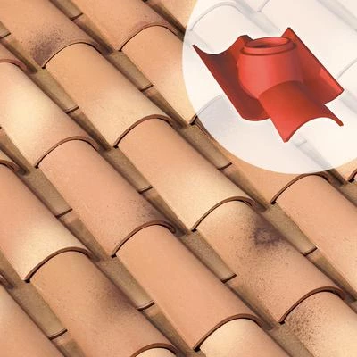 Tuile Ă douille, en terre cuite, diamètre int. du tuyau d’Ă©vacutaion : 150 mm.