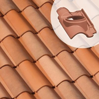 Tuile Ă douille, en terre cuite, diamètre int. du tuyau d’Ă©vacutaion : 150 mm.